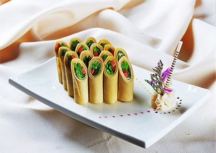 2、在千张上抹酱后将蔬菜与水果卷入,直接食用。