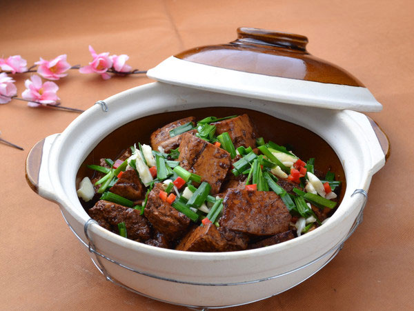 2.将煎好的豆腐放入砂锅加入足够的水,加白砂糖、葱段、姜片,加盖大火烧开后转小火炖1小时。