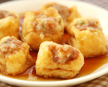 材料:油面筋数个、猪肉馅、干淀粉、老抽、生抽、白砂糖、大葱花、姜末、食盐、木耳、蚝油、黄酒、植物油少许。