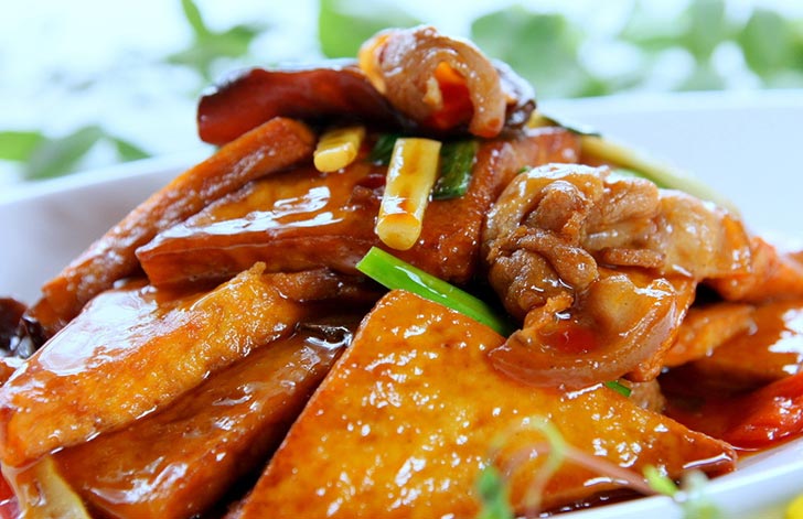 材料:绢豆腐,食用油、香油、酱油、白砂糖、鸡精、食盐适量,八角1粒、姜2片。