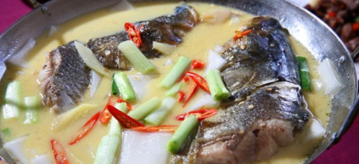 2、起锅烧油至七成热,投入鱼头煎至两面金黄,放入黄酒、姜、白糖、辣椒,放入鲜汤,煮至汤汁粘稠时,投入味精、清美粉皮,上桌时,放入青蒜,即成。